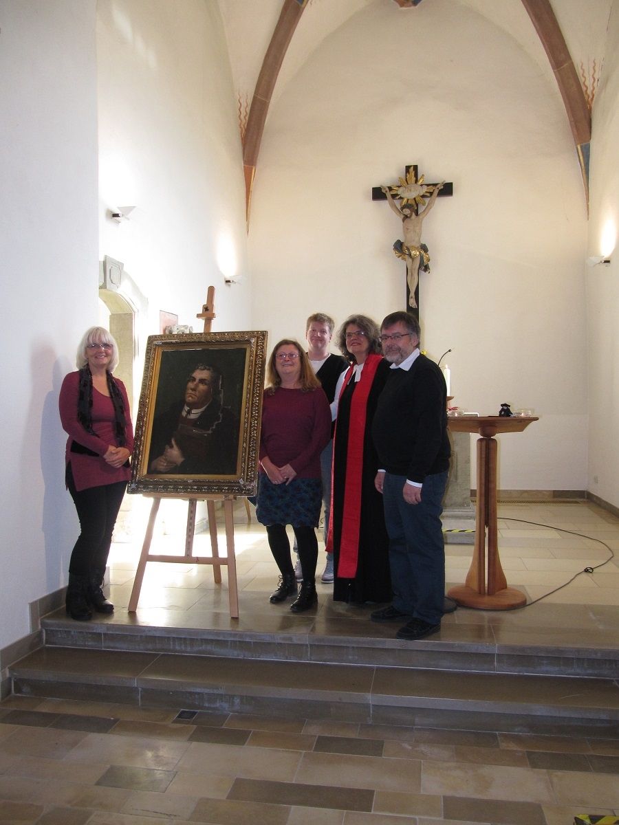 Und es war ein echtes Fest. Martin Luther kehrte heim in seine Kirche, die Petruskirche in Obertürkheim. Jedenfalls ein Bild von ihm, gemalt zum Gedenken an seinen 400 sten Todestag. So kam es, dass viel von alten Zeiten erzählt wurde, an diesem Festtag. Die Erinnerungen an die Konfirmation 1944 wurden wach, als in einer Kirche ohne Dach und ohne Fenster gefeiert wurde, aber voller Dankbarkeit den schweren Luftangriff überlebt zu haben, damals, als das Lutherbild noch dort an der inzwischen abgerissenen Empore prangte und das alte Bild einen großen Riss davontrug. Wie ein Blitz schlägt der Riss auf die Bibel herunter, die der gemalte Luther im Arm hält.